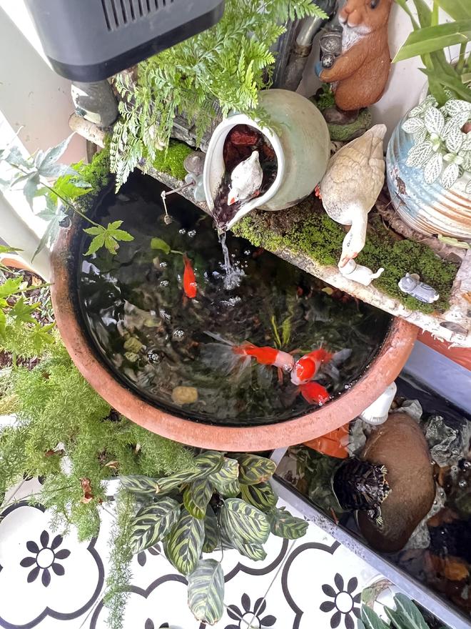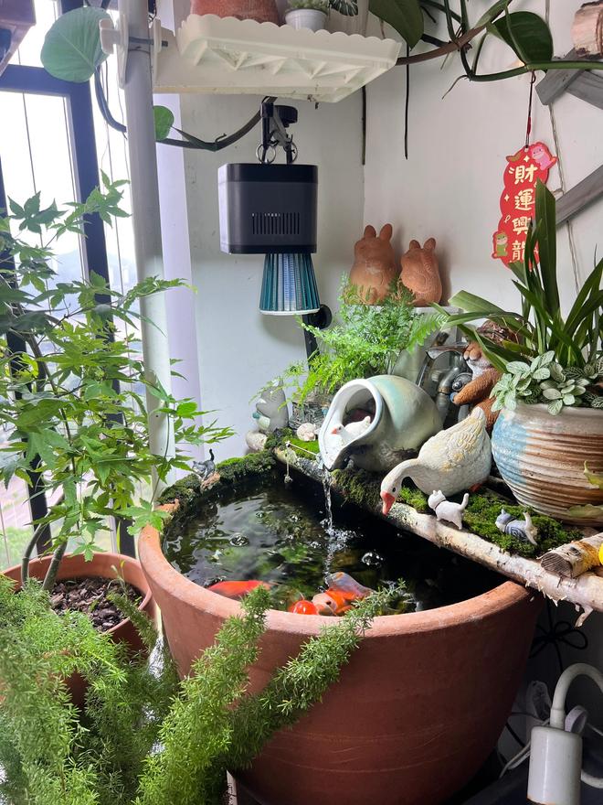 阳台另一端做了一个生态鱼缸,鱼缸上面造了一座小景观,利用循环抽水机制作成了一个小山泉,每天都可以听到细微的流水声,特别的治愈,大缸里养了几条锦鲤,每天活蹦乱跳十分的可爱,循环的流水代表源源不断的福气,幸运的锦鲤寓意生活越来越美满。
